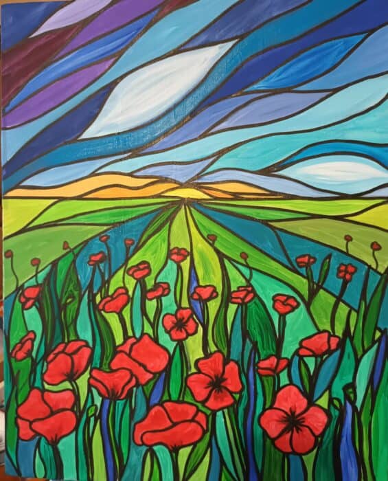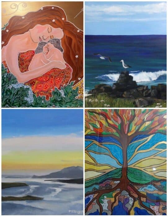 Marie’s are inspired by the landscape and nature. I use acrylic and oil paint.